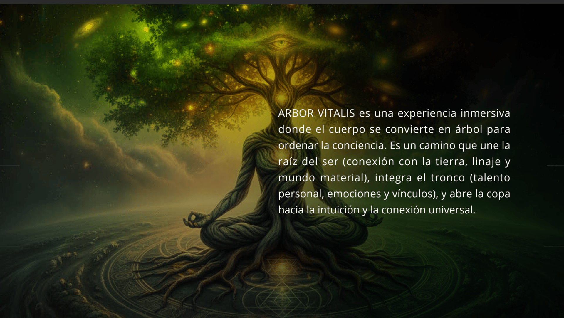 Arbor Vitalis es una experiencia inmersiva de retiro con el objetivo de "ordenar la conciencia" a través de la conexión con la raíz del ser, la integración del tronco (talento personal, emociones y vínculos), y la apertura de la copa hacia la intuición y la conexión universal.
