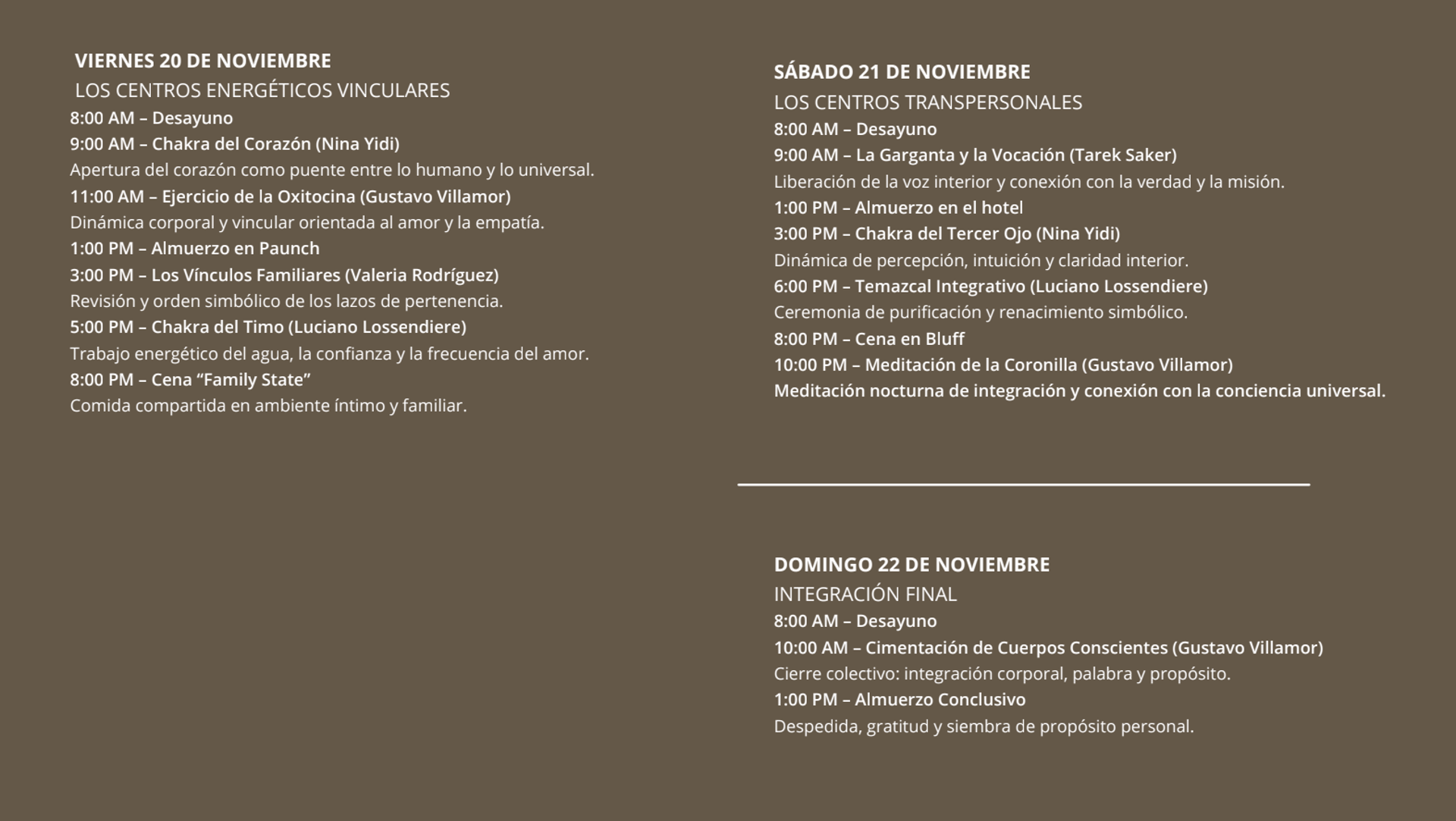 Facilitadores:El retiro cuenta con la sinergia de cinco líderes:
