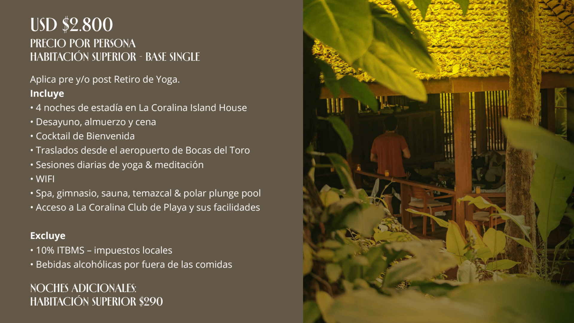 Dum Spiro se lleva a cabo en Bocas del Toro, Panamá, un entorno natural perfecto para la introspección y la transformación personal.