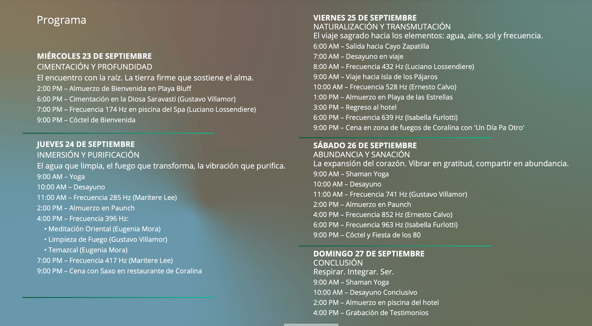 Cada jornada se despliega en prácticas que integran frecuencias sonoras de sanación, sesiones de breathwork, terapias ancestrales como el temazcal, y trabajo con las jerarquías familiares, para abrir la conexión y fortalecer las relaciones.